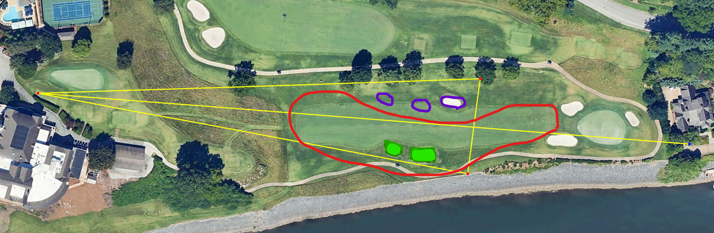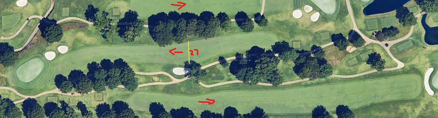The tenth hole starts off the back nine and is a hole more fitting of your local municipal course than a course ranked in the state. The hole is a short-par 4 that doglegs around the driving range. The line on the image below is 300 yards.