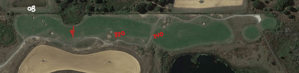 – Driver from the tee: If electing to use driver, the player has to navigate across the cart path to an area that is narrowing to just 45-yards between the bunker on the left and the Out-of-Bounds area right of the hole. If the player is successful on the drive, the second shot is still difficult to negotiate. Again, largely blind, and around 190 to carry the frontal bunkers that deter any ability for a player to run a ball on the green. Out-of-Bounds flanks tight to the right of the green, meaning a wiped fade to the a back pin is likely the last time the ball will be seen.