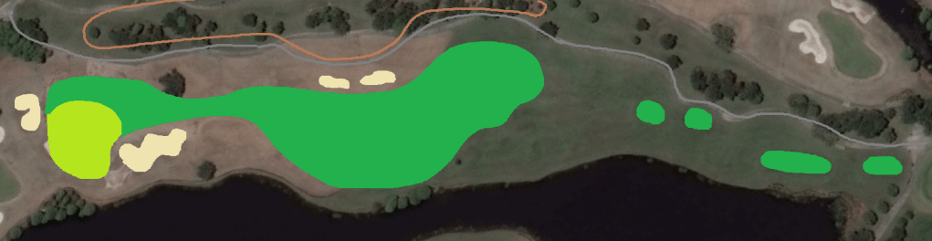 The new hole? The bunkers have all been removed, but for a greenside bunker flanking the front right of the green, and the fairway now curves around the lake. This is good design, on its face, because it does offer more option by allowing to cut off as much of the lake as you can to get it close. Two factors prevent better players from actually doing that though; the bits of leftover Play-Doh from Harman’s design concepts.