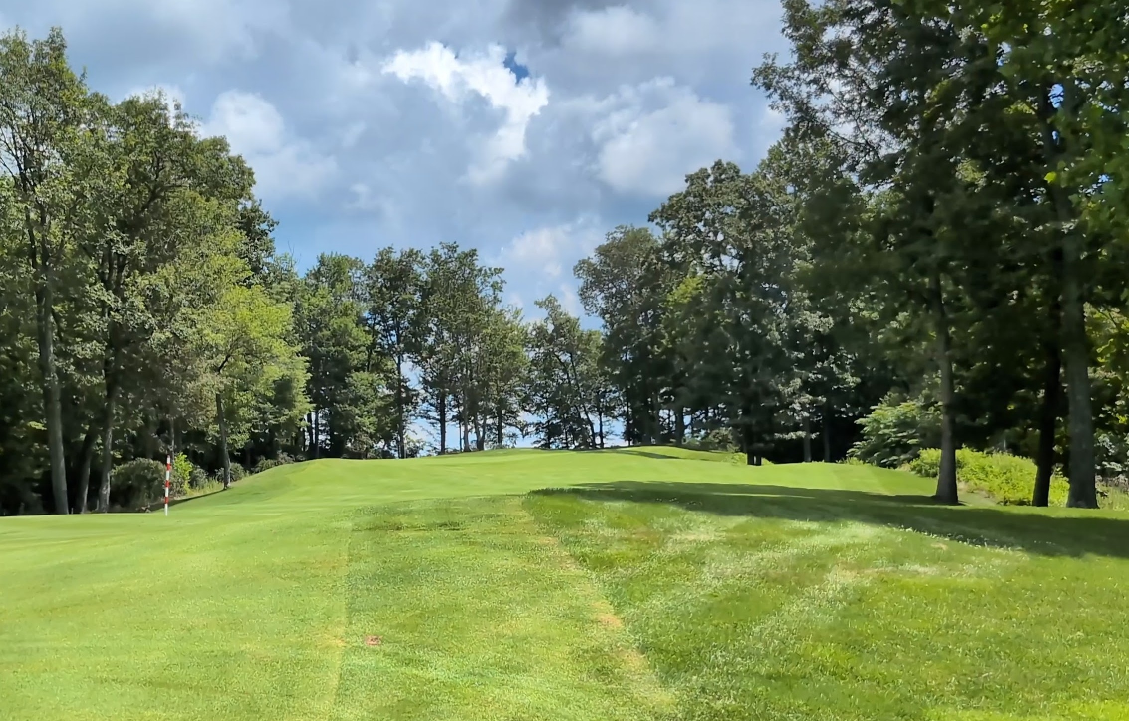 The third hole at the Highland Course is a quirky par-5 where the fairway essentially drops off a cliff at about 240-yards from the tee. A hazard, easily reachable due to the elevation, cuts in on the right at about 330-yards. Essentially, there’s two ways to play this short par-5: layup on top of the hill, leaving around 260 yards into the green, or bomb driver into the narrow pinching area at the bottom of the hill, which will leave a short iron into this green. This is an interesting hole because, the reward in the risk-reward calculus is immense, but the area between the hazard and the trees is only 35-yards wide, meaning it is pretty tough to pull off.